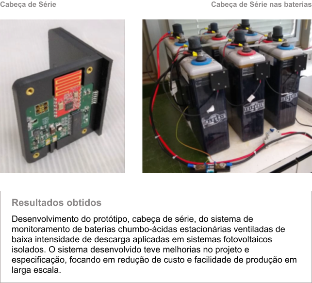 Desenvolver cabeça de série de sistema (hardware e software) de monitoração para detecção de fim de vida útil de baterias chumbo-ácidas estacionárias de baixa intensidade de descarga utilizadas em sistemas fotovoltaicos isolados.