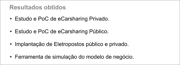 Desenvolvimento de modelo de negócio: infraestrutura de recarga, ferramentas de gerenciamento e prova conceito de mobilidade elétrica compartilhada visando a implantação e expansão do sistema no mercado nacional.