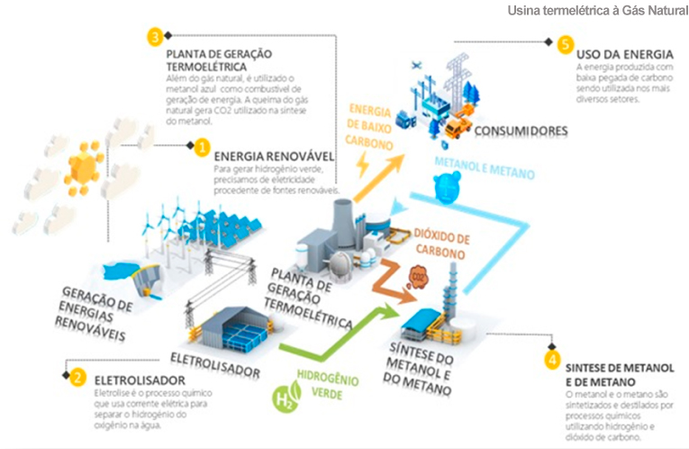 Desenvolvimento de rota tecnológica de transição de usinas térmicas para geração de energia elétrica de baixo carbono por meio da integração da tecnologia de captura de CO2 com hidrogênio renovável para a produção de metano, de metanol e de energia elétrica.