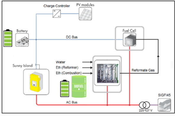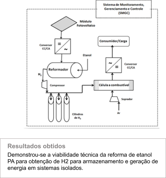 Pesquisa aplicada e Desenvolvimento experimental de um sistema de geração de energia elétrica através de hidrogênio renovável advindo da reforma do etanol laboratorial (analítco) para atender sistemas de geração distribuida em áreas isoladas. Estudos de modelagem e simulação para a proposição de um sistema completo de monitoramento, gerenciamento e controle (SMGC) para sistemas de geração compostos por subsistemas de geração fotovoltaica, produção de hidrogênio por reforma de etanol, armazenamento de hidrogênio e células a combustível.